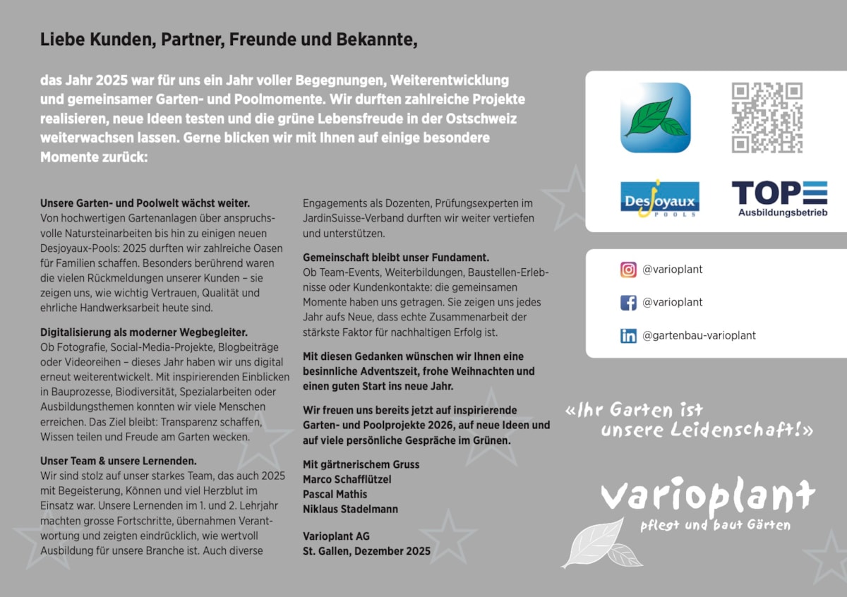 2025 war für die Varioplant AG ein Jahr voller Leben. Voller Wachstum – im Garten wie im Miteinander. Von liebevoll gestalteten Garten-Oasen bis hin zu hochwertigen Poolanlagen haben wir viele kleine Paradiese geschaffen. 💚