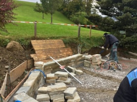 Im Appenzellerland zu einem schönen Holzhaus passt der leicht rötliche Stein einfach perfekt. Vom Hauszugang (Treppe) über den Sitzplatz (Platten) zur Sitzmauer (Trockenmauer) - alles ist erhältlich und wir bringen die Materialien mit Sorgfalt und handwerklichem Geschick zum Einklang. Die Lehrlinge lernen die Steinbearbeitung, das Maschinenführen und die Absteckarbeiten.